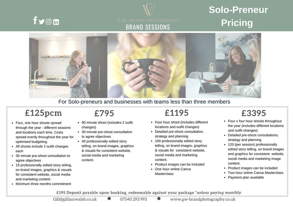 My most popular package is my four hour mid week fully personalised shoot, but equally my monthly mini Content Builder Sessions (see next tab along) are less than £100 and are really popular too.